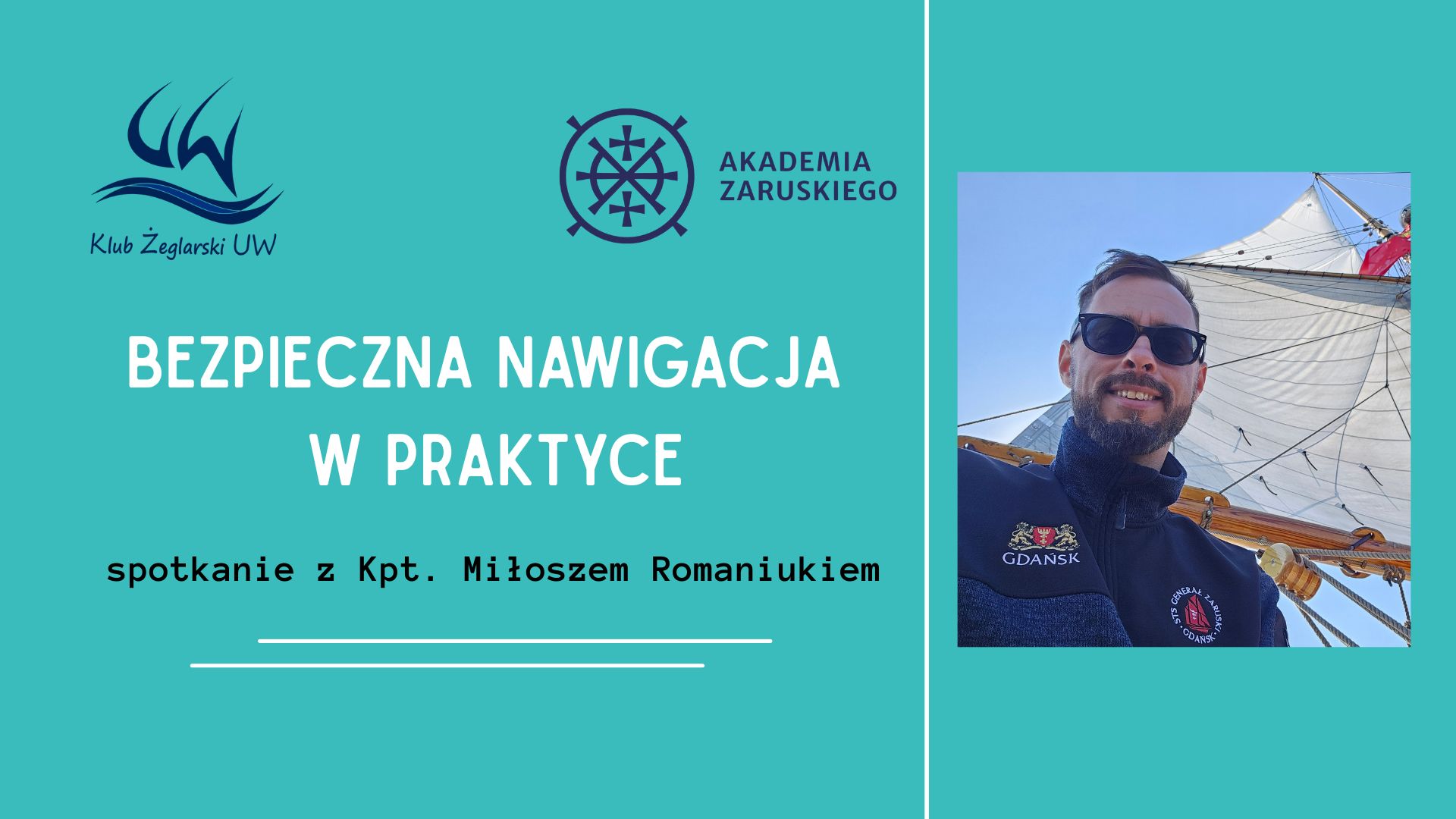 Prelekcję poprowadzi dla nas Kpt. Miłosz Romaniuk – instruktor, naukowiec i wychowawca młodzieży w Szkołach pod Żaglami – opowie, jak naprawdę wygląda odpowiedzialna nawigacja. Z morzem jest związany od 2007 roku, przepłynął ponad 70 tysięcy mil morskich i pływał m.in. na żaglowcach takich jak Zawisza Czarny, Generał Zaruski, Pogoria, Kapitan Borchardt oraz Fryderyk Chopin.
