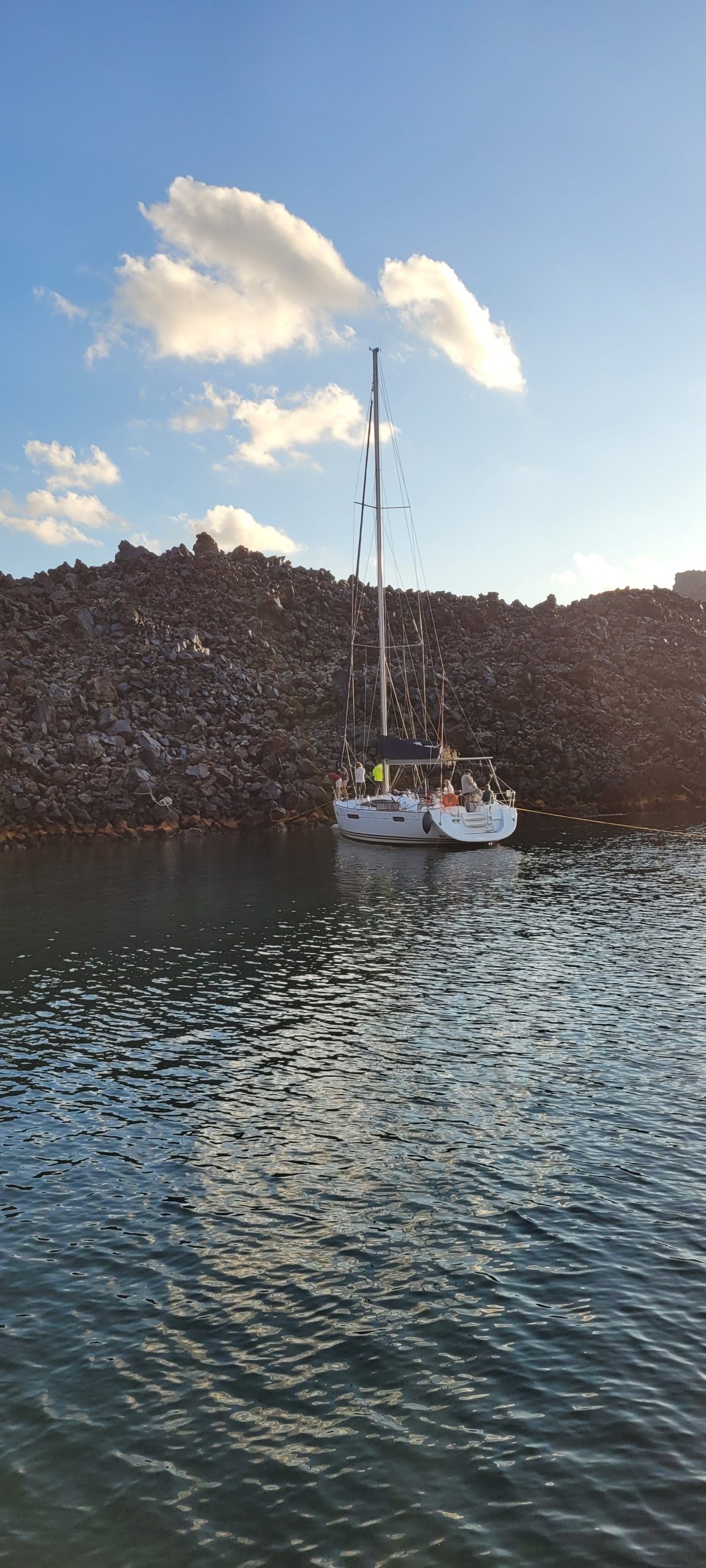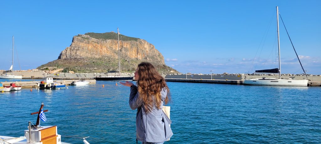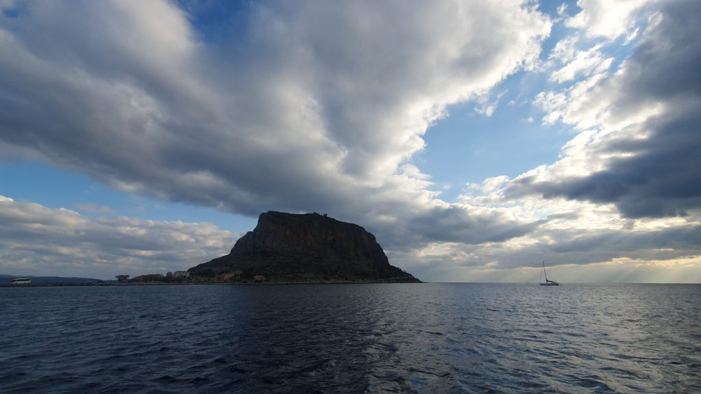Wreszcie prawdziwy przelot nocny, stan morza 4-5B zapewnia upragnione doznania, na które niektórzy czekali aż od Bawarki. Koło 0400 na horyzoncie pojawia się masywna góra, wystająca prosto z morza – Monemvasia. O 5 rano dopływamy i rzucamy kotwicę, falochron na mapach jest zdecydowanie krótszy niż w rzeczywistości, więc postanawiamy poczekać do świtu.