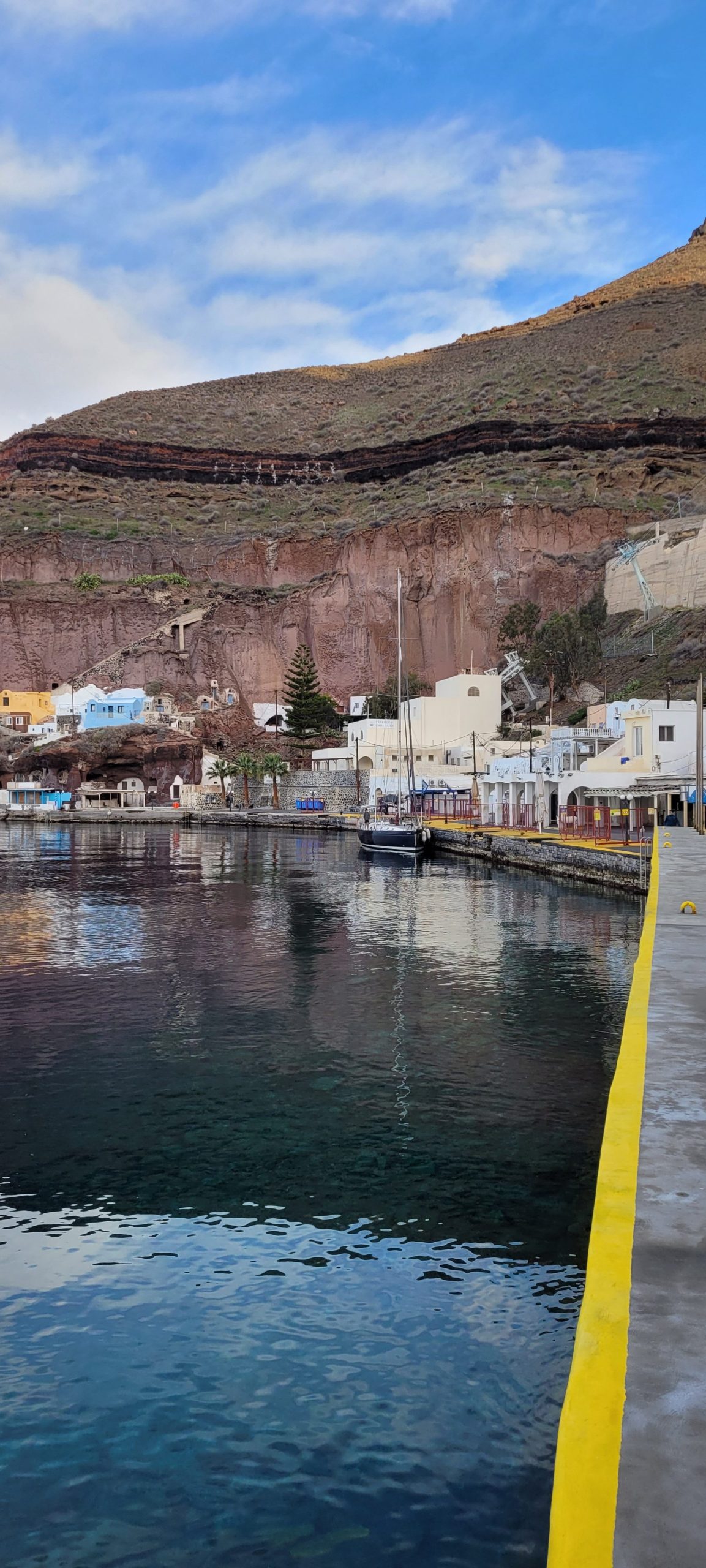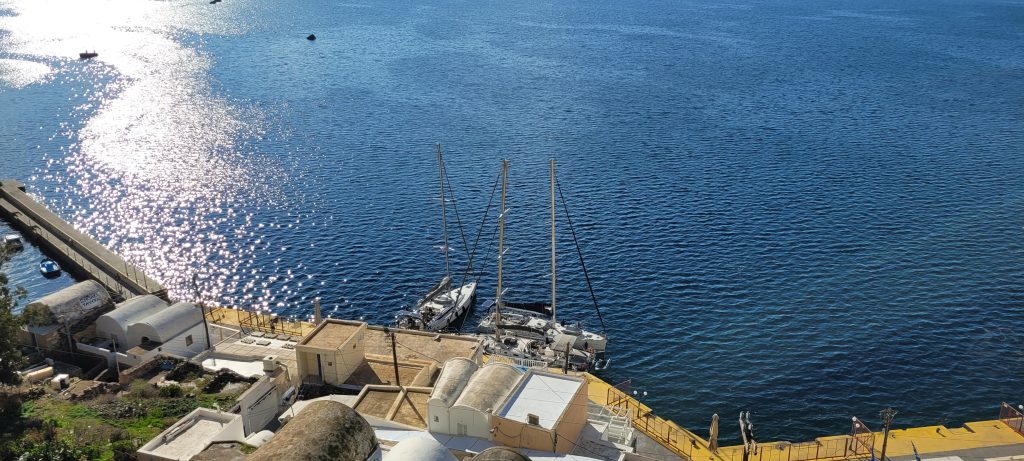 O 0808 zacumowaliśmy na wyspie Santorini, korzystając z braku statków pasażerskich, które w sezonie skutecznie uniemożliwiają ten manewr.