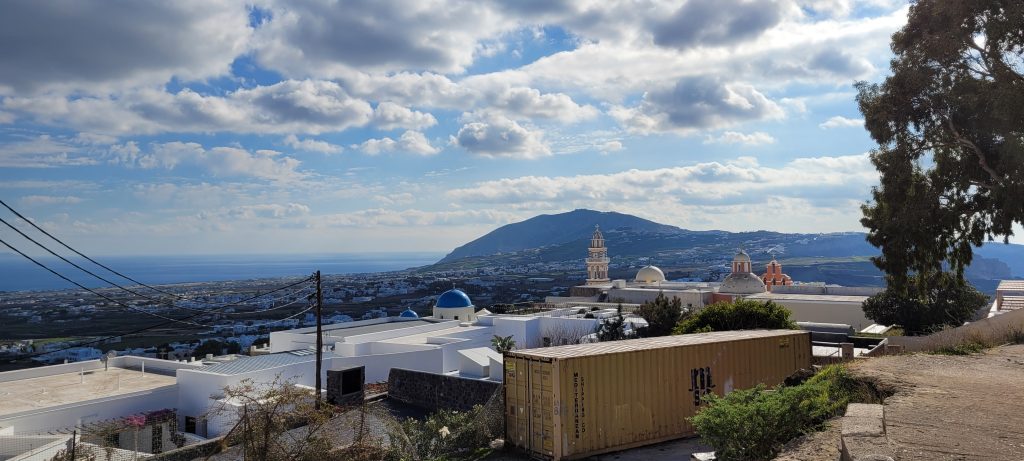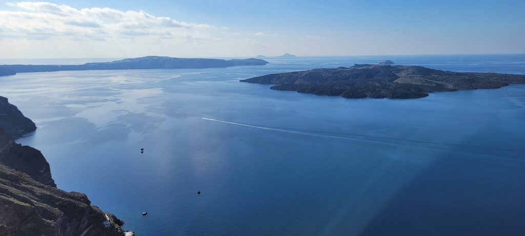 Po 12h spokojnej żeglugi oczom ukazał się niesamowity widok wulkanicznej wyspy, której białe wierzchołki łudząco przypominały śnieg. W rzeczywistości były to śnieżnobiałe budynki stolicy Santorini – Firy.
