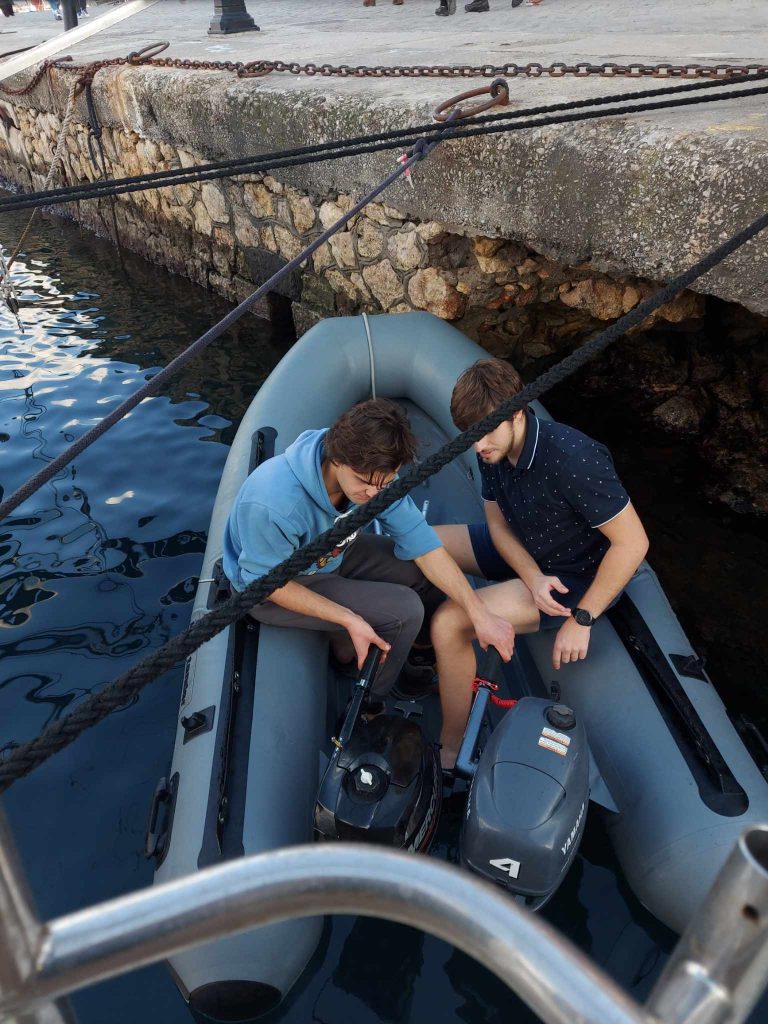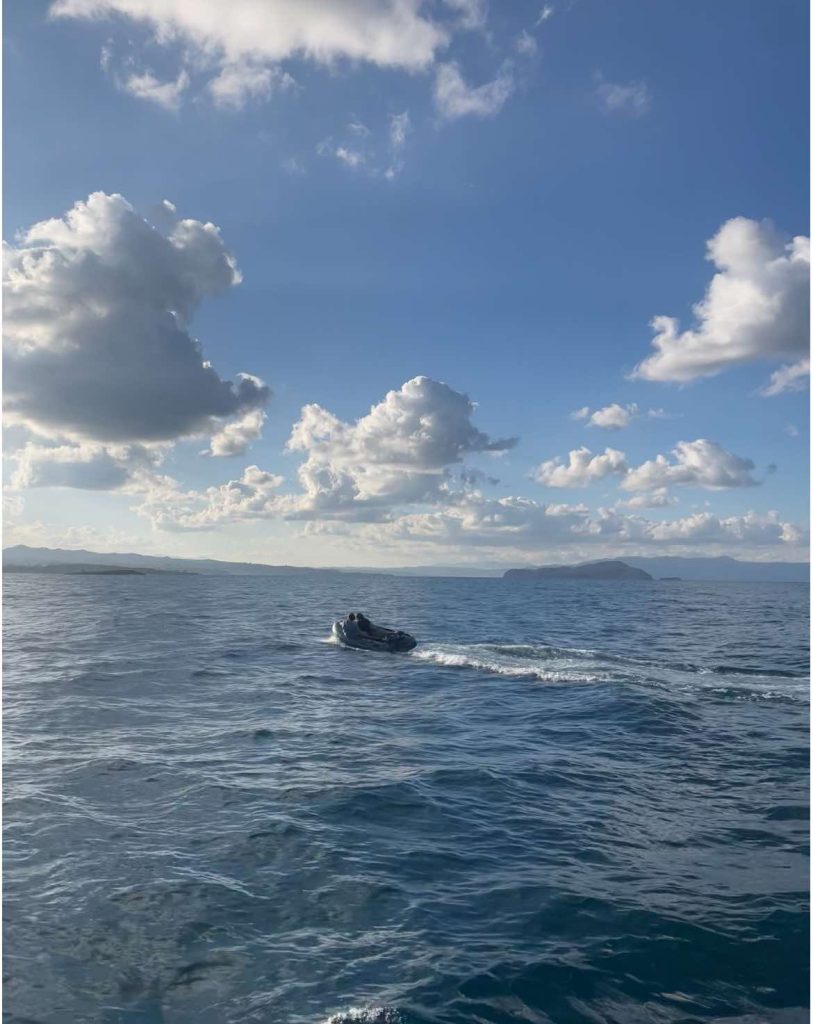 Uzupełniliśmy zapasy i koło 19 wyszliśmy z portu. Nie musieliśmy długo czekać na kolejną przygodę – jeden z jachtów zgubił ponton, z częścią załogi na pokładzie, a resztą na lądzie. Pozostałe jachty ochoczo ruszyły do pomocy i po 2h poszukiwań znaleziono zgubę i odholowano ją do właściciela. Nocną żeglugę w kierunku Delos urozmaicił świecący plankton, który rozświetlał wodę za rufą.